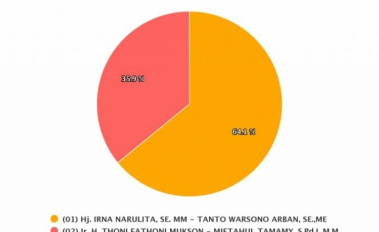 PANDEGLANG – Hasil sementara Pasangan calon petahana Irna Narulita-Tanto Warsono Arban berdasaran aplikasai Sirekap (sistem rekapitulasi suara) KPU, Kamis (10/12/2020) sudah mengantongi 64,1 persen suara. Sementara pasangan Thoni Fathoni Mukson-Miftahul Tamamy meraih 35.9 persen suara.