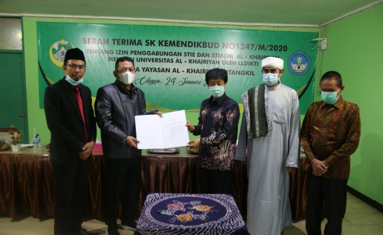 Penyerahan SK yang tercantum dalam Surat Nomor 1247/M/2020 izin dari Kemendikbud diberikan langsung oleh Kepala Lembaga Layanan Pendidikan Tinggi Wilayah IV Jawa Barat-Banten Prof. Dr. Uman Suherman M. Pd dan diterima oleh Ketua PB Al-Khairiyah Ali Mujahidin di Kampus Al-Khairiyah, Minggu (24/01/2021).