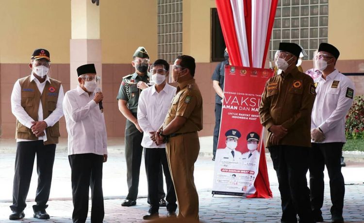 Wakil Presiden Ma’ruf Amin datang bersama rombongan, langsung meninjau proses vaksinasi. Wakil Presiden terlihat sempat menyapa masyarakat yang ikut divaksinasi.