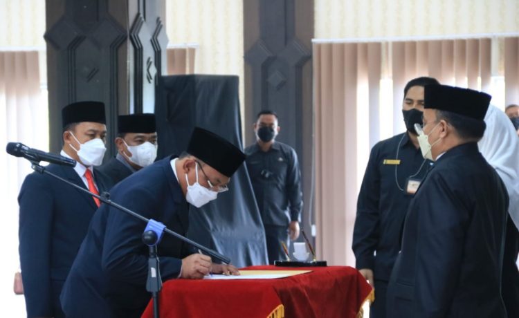 HARITA – Sebanyak 12 Pejabat Tinggi Pratama Pemerintah Kota Cilegon secara resmi dilantik dan diambil sumpahnya oleh Wali Kota Cilegon, Helldy Agustian yang digelar di Aula Dinas Komunikasi dan Informatika, Sandi dan Statistik Kota Cilegon, Senin (15/11/2021).