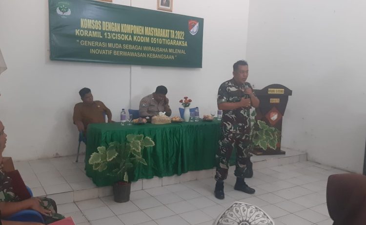 HARITA.ID – Koramil 13/Cisoka Kodim 0510 /Tigaraksa menggelar kegiatan Komunikasi Sosial (Komsos) dengan komponen masyarakat, mengajak generasi muda Milenial agar kreatif dan inovatif yang dilaksanakan di aula Koramil 13 Cisoka Desa Munjul Kec Solear Kab Tigaraksa, Senin 21 November 2022.
