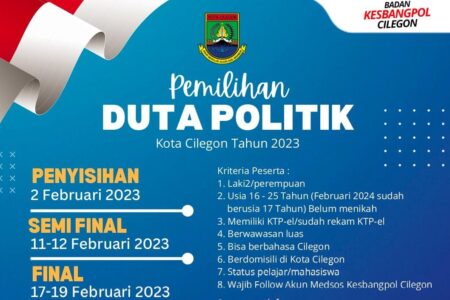 Badan Kesbangpol Kota Cilegon membuka pendaftaran Duta Politik Kota Cilegon Tahun 2023 dari tanggal 20 Desember 2022 sampai dengan 25 Januari 2023 melalui website http://kesbang.cilegon.go.id