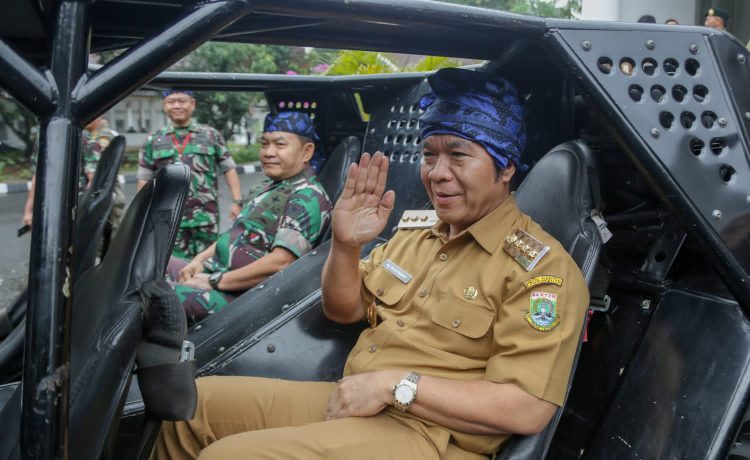 HARITA.ID – Penjabat (Pj) Gubernur Banten Al Muktabar bersama Kepala Staf Angkatan Darat (KSAD) Jenderal TNI Dudung Abdurachman dan Danrem 064 Maulana Yusuf Brigjen TNI Tatang Subarna menaiki Kendaraan Taktis (Rantis) P6 ATAV (All Terrain Assault Vehicle) usai Pembukaan Gebyar Expo UMKM Provinsi Banten dan Pameran Alutsista di Alun-Alun Kota Serang, Senin 26 Desember 2022. P6 ATAV merupakan salah satu kendaraan taktis di satuan elit TNI.