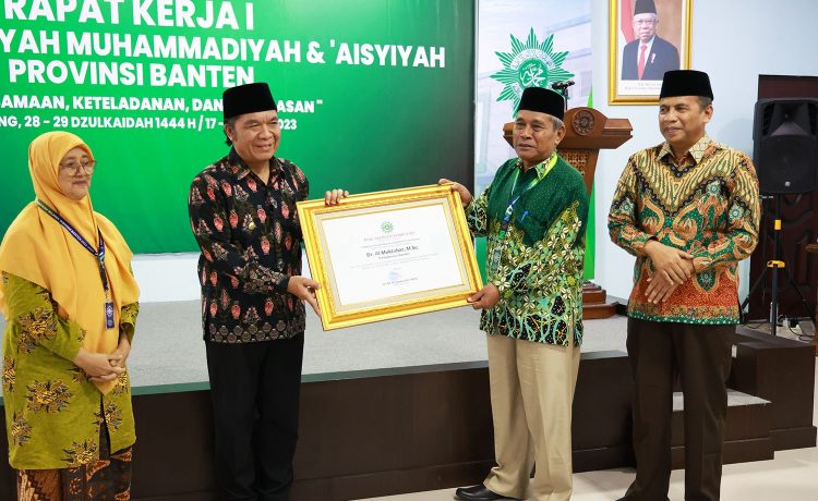 HARITA.ID – Penjabat (Pj) Gubernur Banten Al Muktabar meraih penghargaan dari Pimpinan Wilayah (PW) Muhammadiyah Provinsi Banten. Penghargaan diserahkan Ketua PW Muhammadiyah Syamsudin kepada Al Muktabar pada Pembukaan Rapat Kerja (Raker) Muhammadiyah I PW Muhammadiyah dan Aisyiyah Provinsi Banten, Sabtu 17 Juni 2023, di Gedung Dakwah PW Muhammadiyah Provinsi Banten, Jl. Ki Ajurum, Cipocok Jaya, Kota Serang.