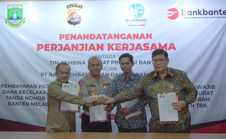 Proses penandatanganan Perjanjian Kerja Sama tersebut dilakukan oleh Tim Pembina Samsat Provinsi Banten yang terdiri dari Plt. Kepala Bapenda Provinsi Banten, Deni Hermawan; Wakil Direktur Lalu Lintas Polda Banten, AKBP Kukuh Priyo; Kepala Jasa Raharja Cabang Banten, Saldhy Susanto; dan Direktur Utama Bank Banten, Muhammad Busthami.