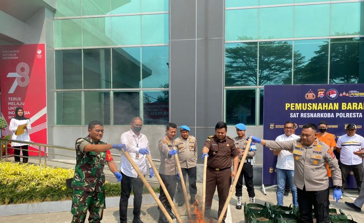 HARITA.ID – Satuan Reserse Narkoba (Satresnarkoba) Polresta Tangerang bersama Kejaksaan Negeri Kabupaten Tangerang dan TNI melakukan pemusnahan barang bukti berupa 8 batang pohon ganja, Selasa 29 Agustus 2023.