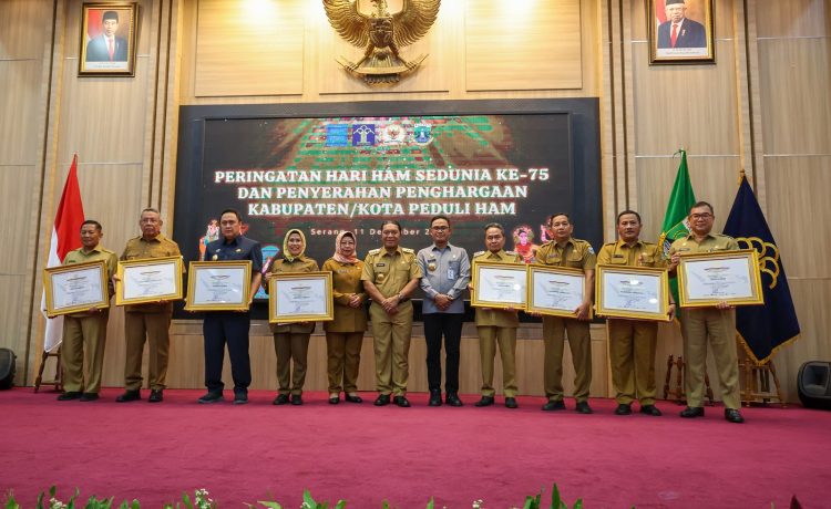 “Selamat atas segala prestasi yang dicapai. Pencapaian-pencapaian yang kita dapat ini hasil kerjasama kita semua,” ungkap Al Muktabar saat memberikan sambutan pada Peringatan Hari HAM se-Dunia ke-75 dan Penyerahan Penghargaan Kabupaten/ Kota Peduli HAM di Pendopo Gubernur Banten, Senin 11 Desember 2023.