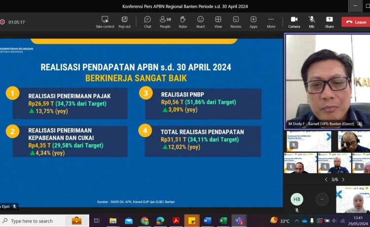 Kinerja APBN Provinsi Banten sampai dengan 30 April 2024 menunjukkan hasil yang sangat baik. Hal ini terlihat dari pendapatan negara yang tumbuh positif dan adanya pertumbuhan realisasi belanja negara (yoy). Hal ini disampaikan oleh para pimpinan Kemenkeu Regional Banten yakni Plt. Kepala Kanwil Ditjen Perbendaharaan Provinsi Banten, M. Dody Fachrudin, Kepala Kanwil Ditjen Pajak Provinsi Banten, Cucu Supriatna, Kepala KPU Bea dan Cukai Soekarno Hatta, Gatot Sugeng W., dan Kepala Kanwil Ditjen Kekayaan Negara Banten, Djanurindro Wibowo dalam siaran pers yang diselenggarakan secara online melalui Microsoft Teams Meeting.