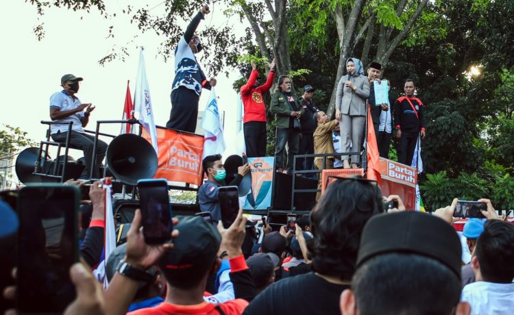 HARITA.ID – Ria Mahdia Fitri Sekretaris Komisi III beserta H. A. Jazuli Abdillah Anggota Komisi I DPRD Banten menemui sejumlah masa aksi yang berdemonstrasi menolak kenaikam harga BBM di depan Gedung DPRD Banten, Selasa (13/09/2022).
