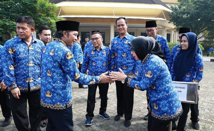 HARITA.ID – Penjabat (Pj) Gubernur Banten Al Muktabar melakukan halal bihalal dengan para Aparatur Sipil Negara (ASN) Pemerintah Provinsi Banten usai melakukan Peringatan Hari Pendidikan Nasional dan Hari Otonomi Daerah XXVII di Lapangan Upacara Sekretariat Daerah (Setda) Provinsi Banten, KP3B Curug, Kota Serang, Selasa 02 Mei 2023.