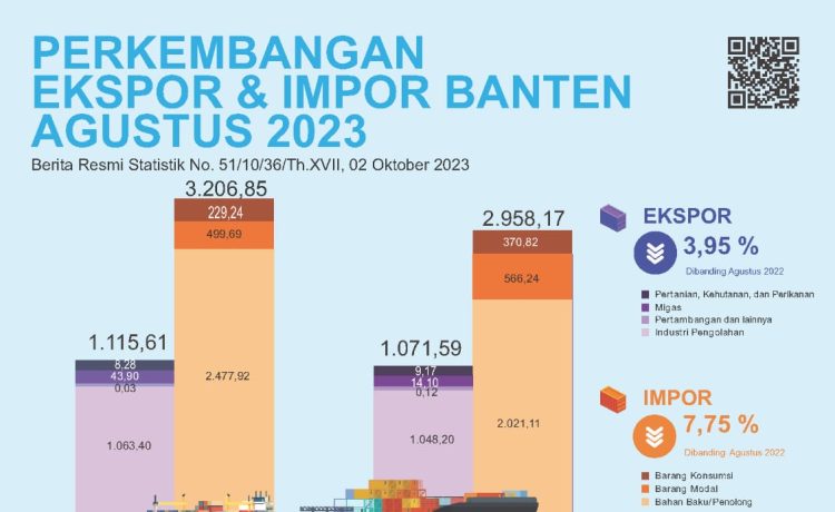 Perkembangan ekspor dan impor itu dikeluarkan oleh Badan Pusat Statistik (BPS) Provinsi Banten pada 02 Oktober 2023 melalui Berita Resmi Statistik No. 51/10/36/Th.XVII.